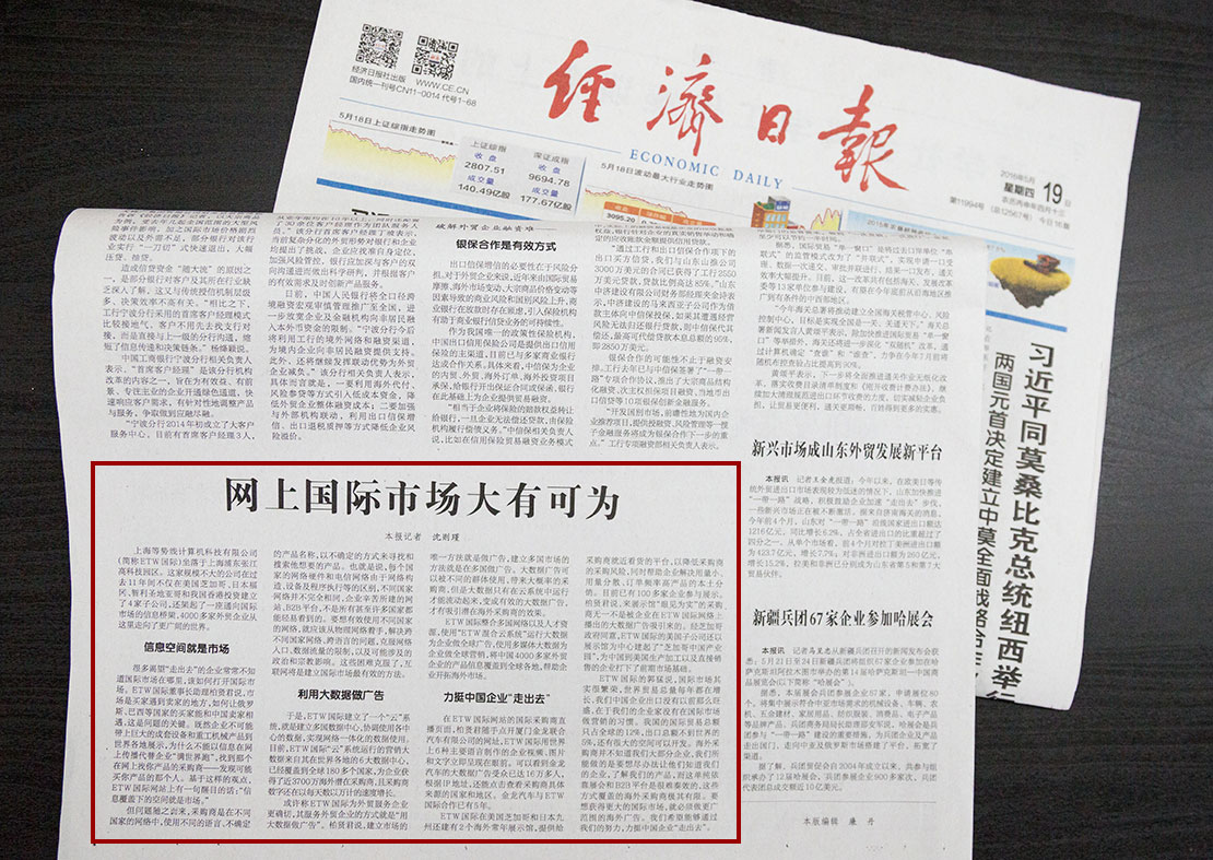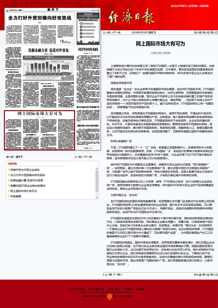 經(jīng)濟日報:力挺ETW帶領(lǐng)中國企業(yè)“走出去” http://paper.ce.cn/jjrb/html/2016-05/19/content_301382.htm