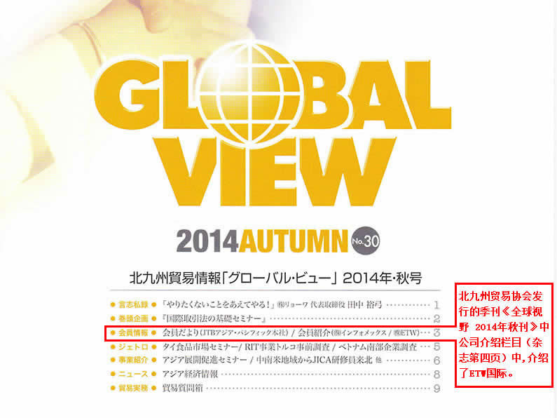 北九州貿(mào)易協(xié)會發(fā)行的季刊《全球視野 2014年秋刊》(日文名「グローバル?ビュー2014年秋號」)中公司介紹欄目(雜志第四頁)中,介紹了ETW國際。